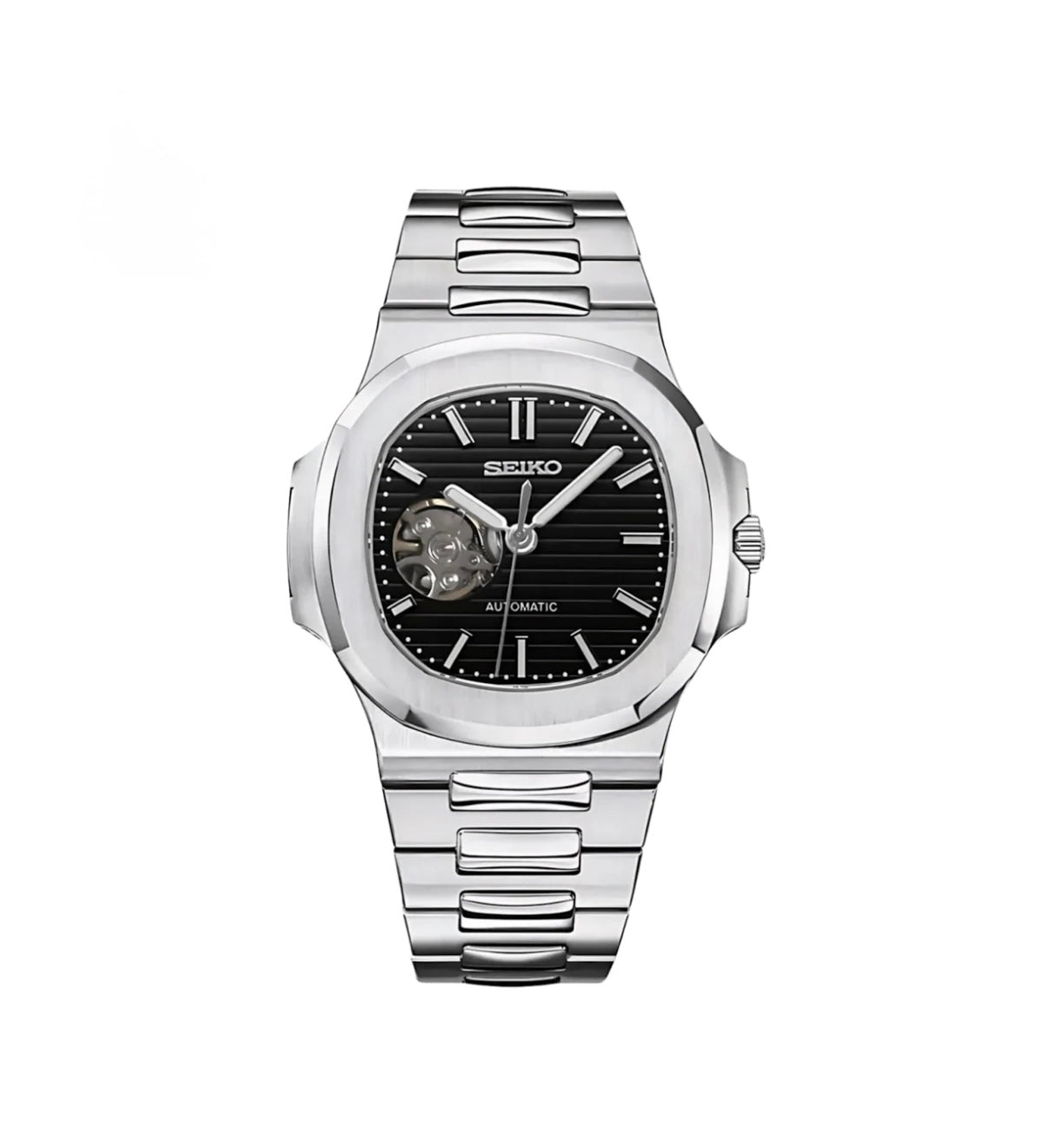 The Nautilus “Black” strips things down to pure steel and shadow. Clean lines. Open heart movement. That sharp black dial stares back like it knows something you don’t.